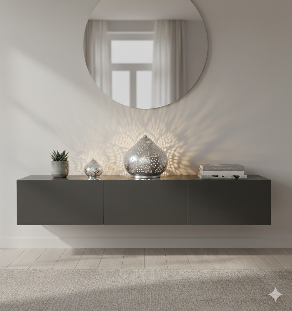 Jede Leuchte ist ein Unikat aus ägyptischer Handarbeit. In traditioneller Technik werden feine Messingplatten von erfahrenen Kunsthandwerkern geformt, von Hand gestanzt und anschließend galvanisch versilbert. Diese filigrane Fertigung verleiht jeder Leuchte ihre einzigartige Struktur und ihr unverwechselbares Lichtbild. Durch direkte und faire Zusammenarbeit mit lokalen Werkstätten trägt Amun-Online zur Bewahrung jahrhundertealter Metallkunst bei – nachhaltig, authentisch und ethisch produziert.