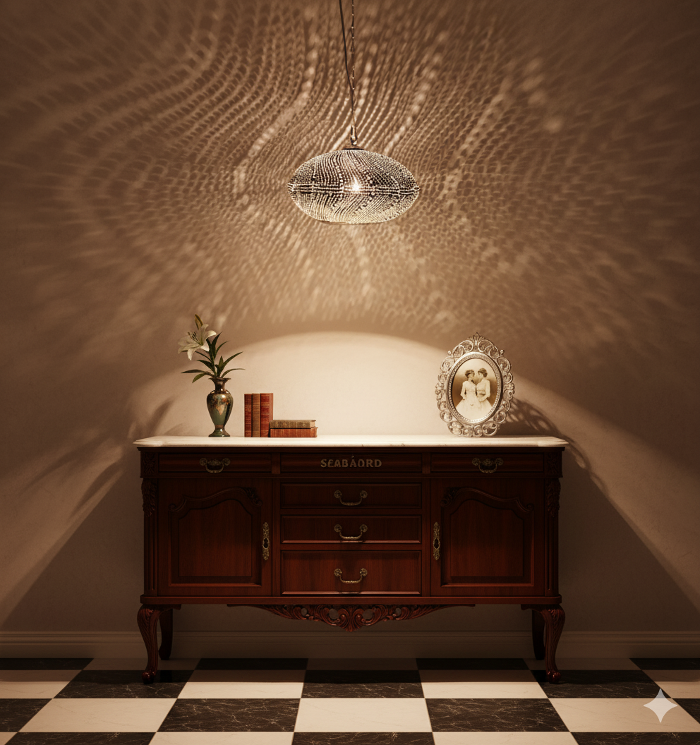 Versilbertes Messing: Das Messing, kunstvoll mit echtem Silber versilbert, verleiht der Leuchte einen modernen und eleganten Glanz. Die versilberte Oberfläche fängt das Licht auf sanfte Weise ein und verleiht Ihrem Raum eine subtile Eleganz, die eine beruhigende und einladende Atmosphäre schafft.