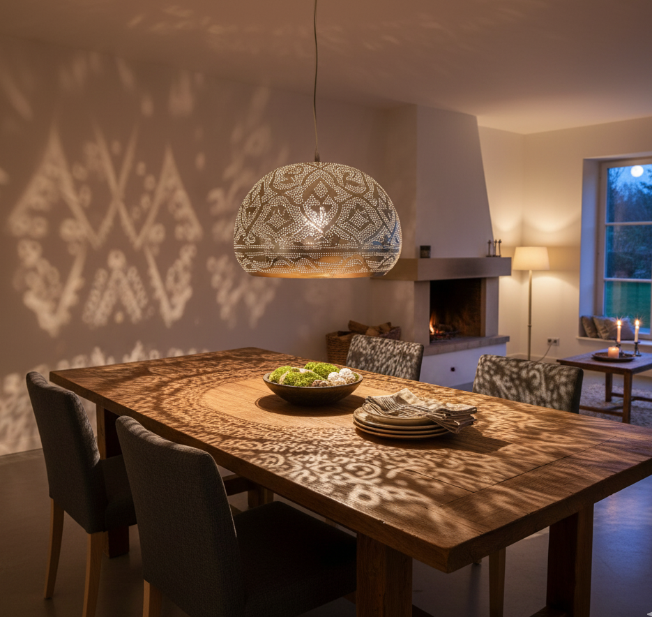 Strahlende Lichtwirkung: Durch das offene Design kann das Licht ungehindert in den Raum fließen, während das filigrane Muster zarte, tänzelnde Schatten wirft. Dieses besondere Lichtspiel sorgt für eine gemütliche und zugleich edle Atmosphäre, die jeden Raum aufwertet.