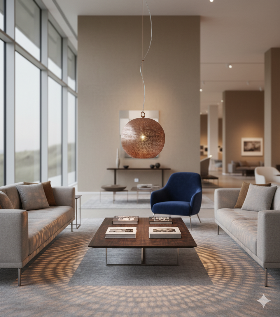 Entdecken Sie die Magie des Lichts mit der bezaubernden 66-6 Hängeleuchte Lassen Sie sich von der 66-6 Hängeleuchte in eine Welt voller Wärme und Eleganz entführen. Diese atemberaubende Leuchte ist mehr als nur eine Lichtquelle – sie ist ein Kunstwerk, das Ihre Räume in eine Oase der Gemütlichkeit verwandelt. Stellen Sie sich vor, wie das sanfte Licht durch das filigrane Lochmuster tanzt und Ihren Raum in ein Meer aus goldenen Schatten taucht. Die kupferbeschichtete Oberfläche fängt jeden Lichtstrahl ein und reflektiert ihn in warmem Glanz, der Ihre Gäste verzaubern wird. Mit ihrem kompakten Durchmesser von 50 cm ist diese Leuchte der perfekte Begleiter für intime Abendessen, gemütliche Leseecken oder als stimmungsvolles Highlight über Ihrer Kücheninsel. Ihr zeitloses Design verbindet moderne Eleganz mit einem Hauch von Nostalgie – ein Schmuckstück, das in jedem Raum die Blicke auf sich zieht.